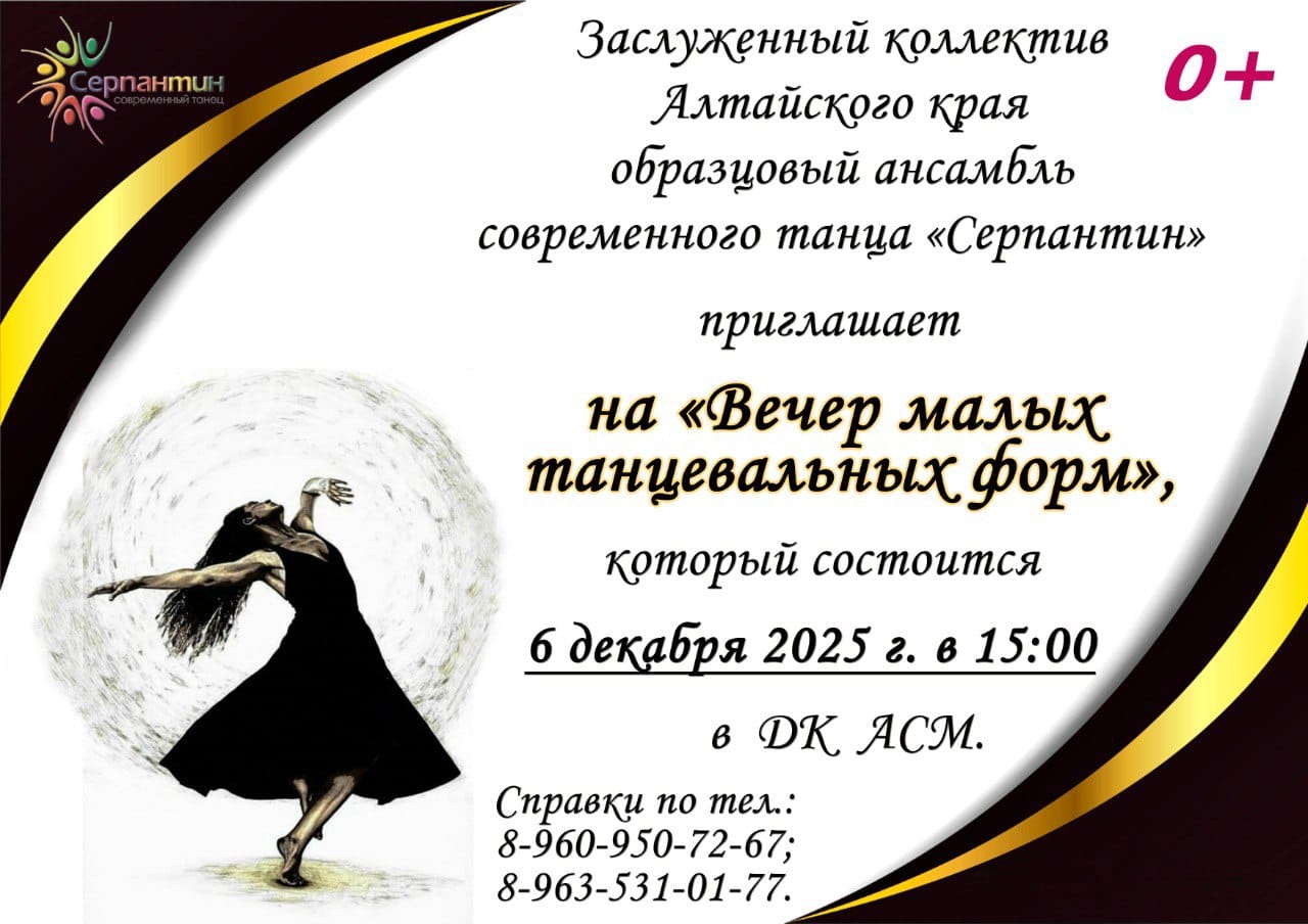 06 декабря 2025 в 15.00 Дворец культуры «Тракторостроитель» приглашает на «Вечер малых танцевальных форм» Заслуженного коллектива Алтайского края образцового ансамбля современного танца «Серпантин», который состоится в доме культуры «Алтайсельмаш» Коллектив...