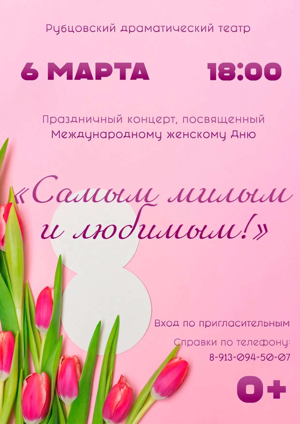 6 марта в 18:00 Дворец культуры «Тракторостроитель» приглашает на праздничную программу «Самым милым и любимым», посвященную Международному женскому дню, который состоится в Рубцовском драматическом театре. В этот праздничный день о...