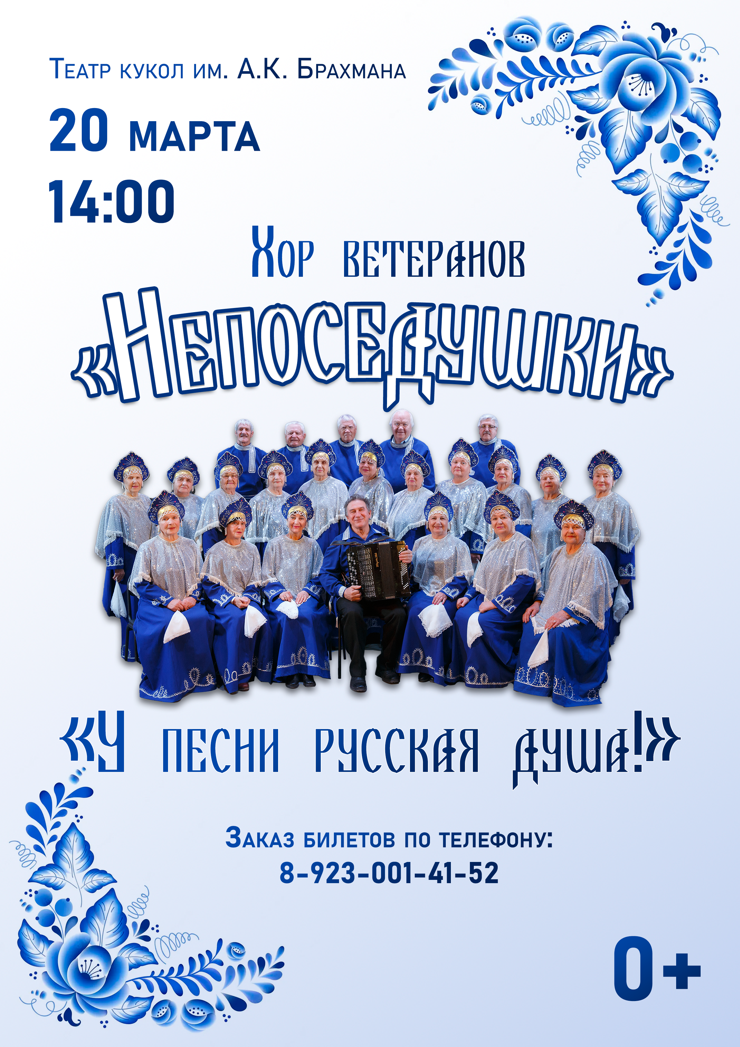20 марта в 14.00 в театре кукол имени А.К.Брахмана состоится концерт хора ветеранов «Непоседушки» имени Николая Боровикова «У песни русская душа». Коллектив существует уже более 20 лет. В концертной программе...